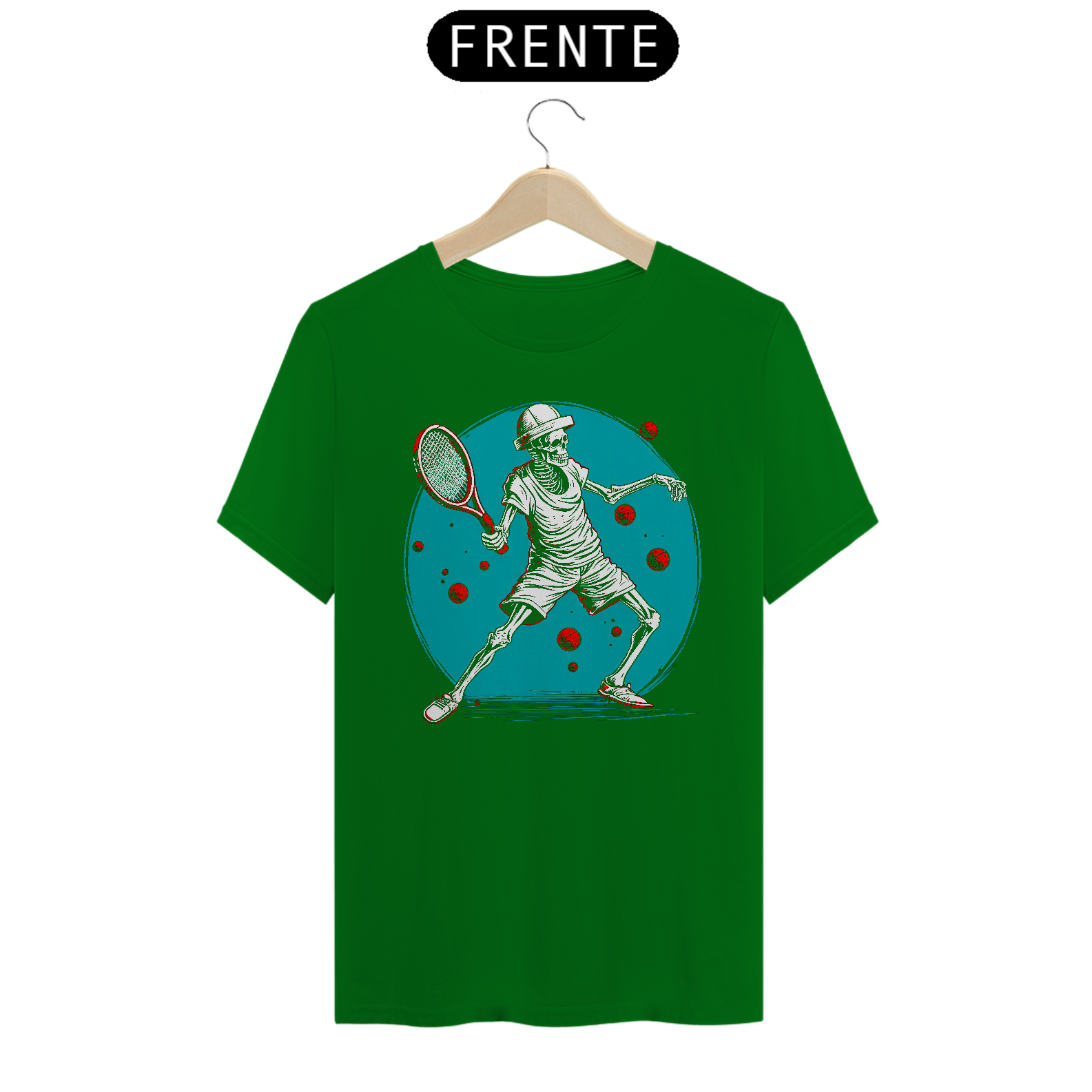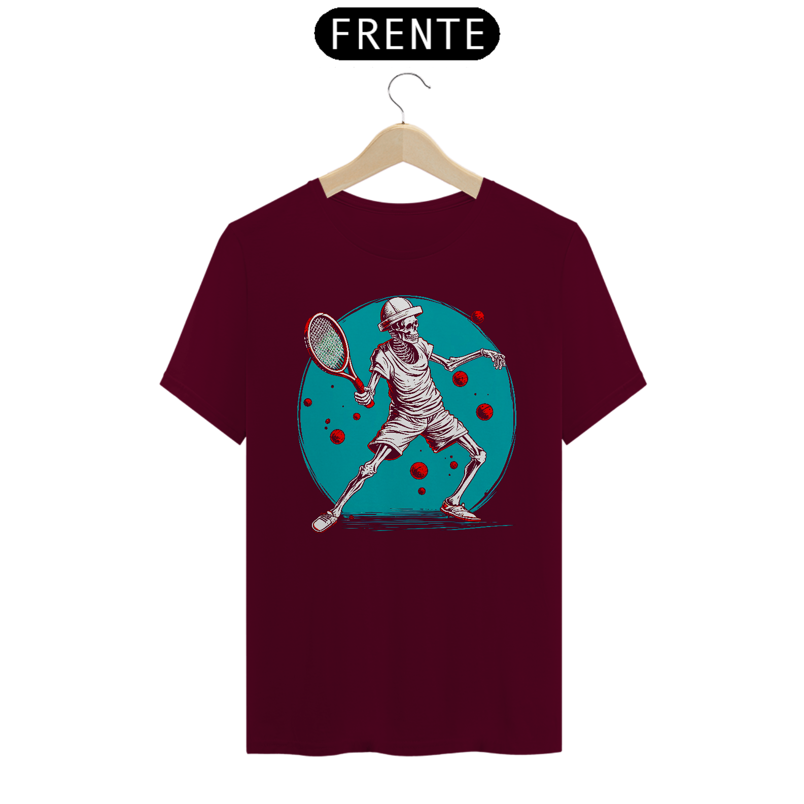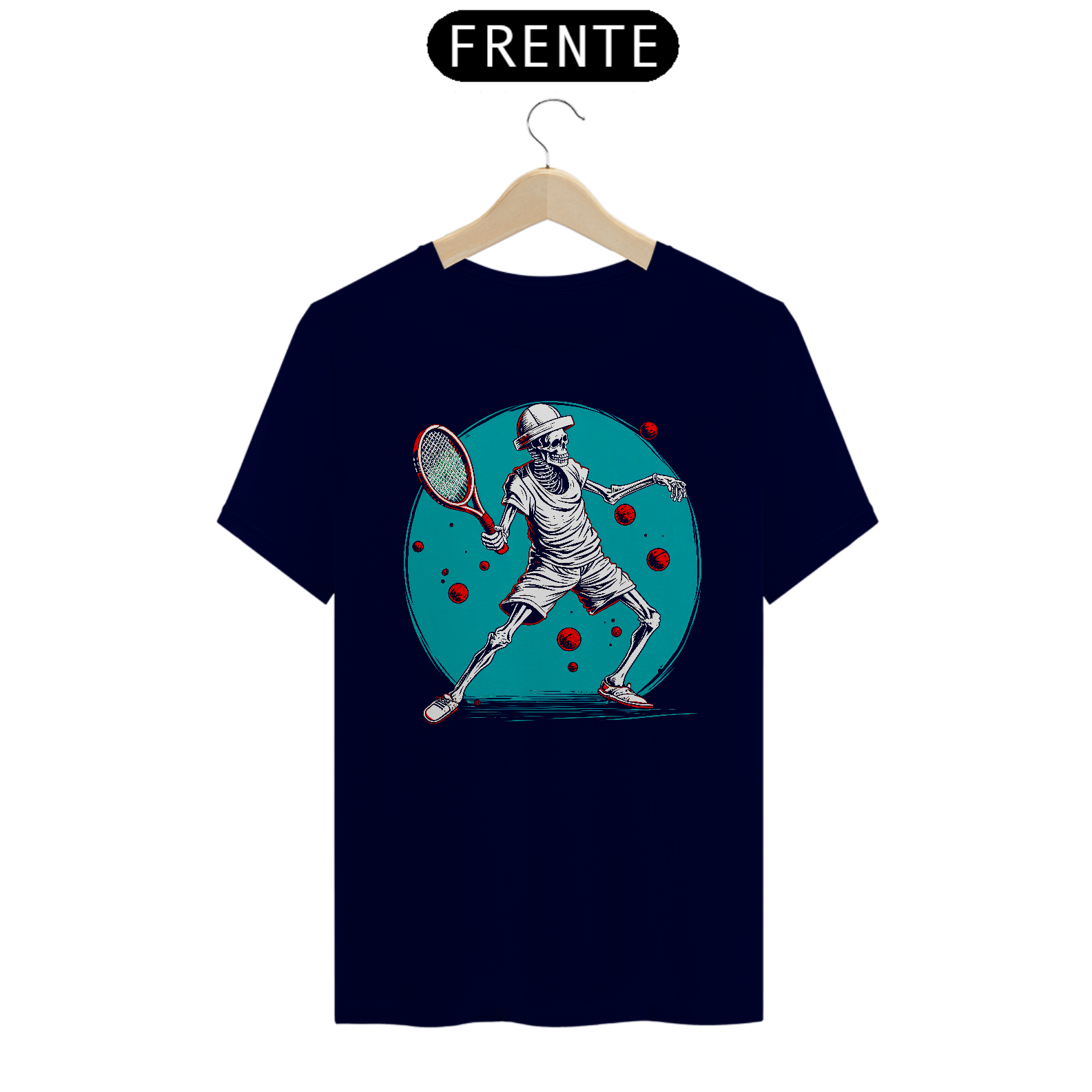 • Arte única e detalhada: Ilustração estilizada de um esqueleto jogando tênis, com um fundo vibrante e bolas flutuantes, dando um ar dinâmico e moderno.
